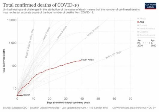 Както можете да видите в тази диаграма, COVID-19 остава най-добре контролиран в Южна Корея, Тайван и Сингапур. Тайван едва ли е видим долу в дъното на графиката, а в Сингапур няма достатъчно смъртни случаи, за да бъде включен в диаграмата.